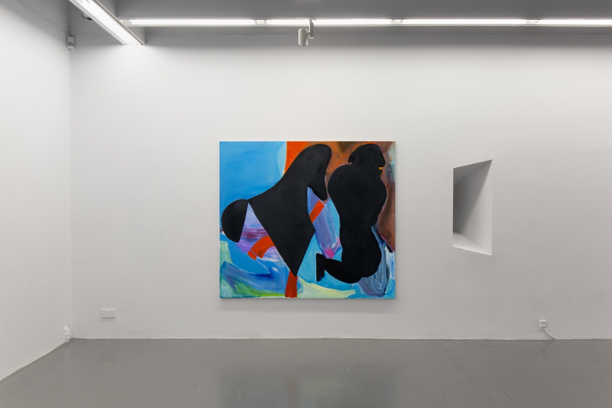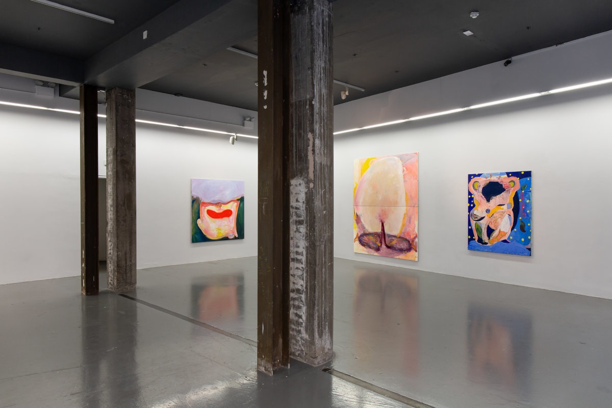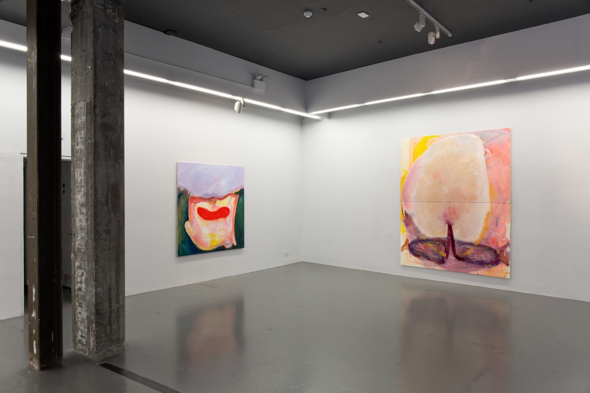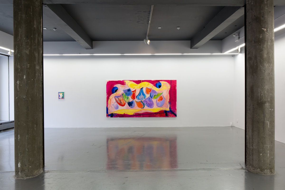 Aileen Murphy’s new group of paintings respond to a series of fundamental questions posed by the artist to herself: Among others, How can a painting remain open and yet still hold together? What is elastic space? How can painting complicate its own space, or abstract the figure? In her studio, Murphy states that each work also asks a different question, and each possesses a different voice. Fellow painter and friend, Julia Dubsky, describes Aileen Murphy’s paintings as ‘recalcitrant’. Deriving from the verb ‘to kick back’, this description conveys much of the physical energy and formal qualities of Murphy’s practice. The less literal meaning, disobedience, gestures to the artist’s emotional or psychological attitude to her work. Dubsky writes: “I sense particular recalcitrance in [her] painting in the contrast between the sweetness of [her] subjects, candy colours, forthcoming and plentiful qualities — and [her] paint handling that I find, at times, disgusting, bratty, horny. It’s unreasonable!!”1. Murphy bucks style and taste in a manner that draws out deeply human physical or emotional sensations such as laughing, crying, kissing, licking. When felt intensely, these are uncontrollable actions, and Murphy amplifies their physicality, sound and texture through a vivid palette and defiant gestural mark-making.