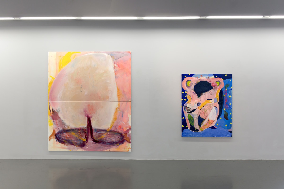 In the age of mass media, artworks must emphasise, exaggerate, abstract, or extrapolate their meaning, or intended affect, in order to claim an individual identity under circumstances where the viewer’s attention is compromised. Manuela Ammer describes how the paintings of Elizabeth Murray fight against this onslaught of ‘affecting’ imagery we encounter continuously outside of the art gallery and how, as a result, Murray’s paintings are “immoderate and behave inappropriately. They take up too much space, are too loud, too garish, and seem unsure of the viewers’ presence or rather their capacity for empathy”2. Aileen Murphy’s paintings share some of these assertive qualities, and also successfully invite viewers to empathise with the figures she depicts. If shown as figures at all, the bodily parts or fleshy forms, have a soft, fluid, malleable density, open to adaptation and change. Many of the figures are depicted crouching, squatting or kneeling, and with exposed wounds or openings in the flesh. Images of babies appear too, but so do other more unspecific/shapeless forms, like potatoes, pebbles, clouds, and eggs, and Murphy is happy for these to be interchangeable (for example a bear can just as easily be read as a burrito, or an ancient Egyptian canopic urn).