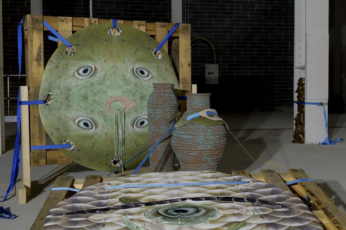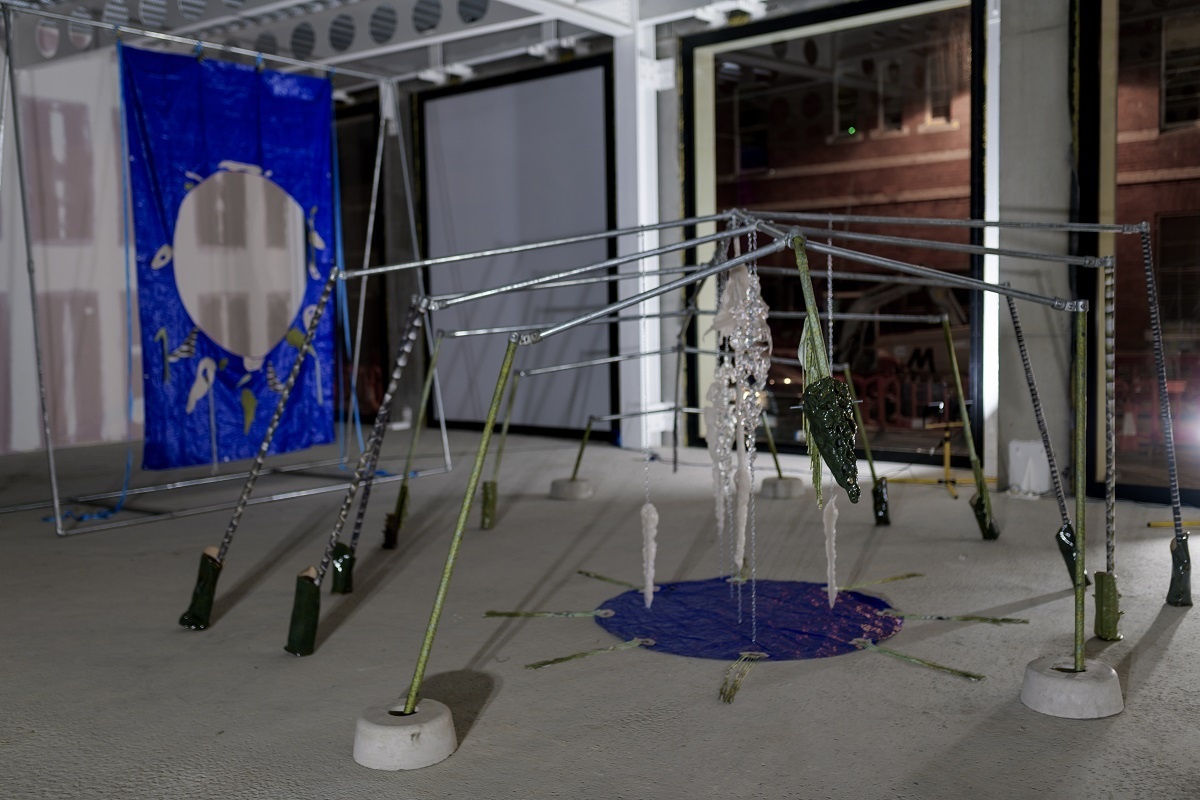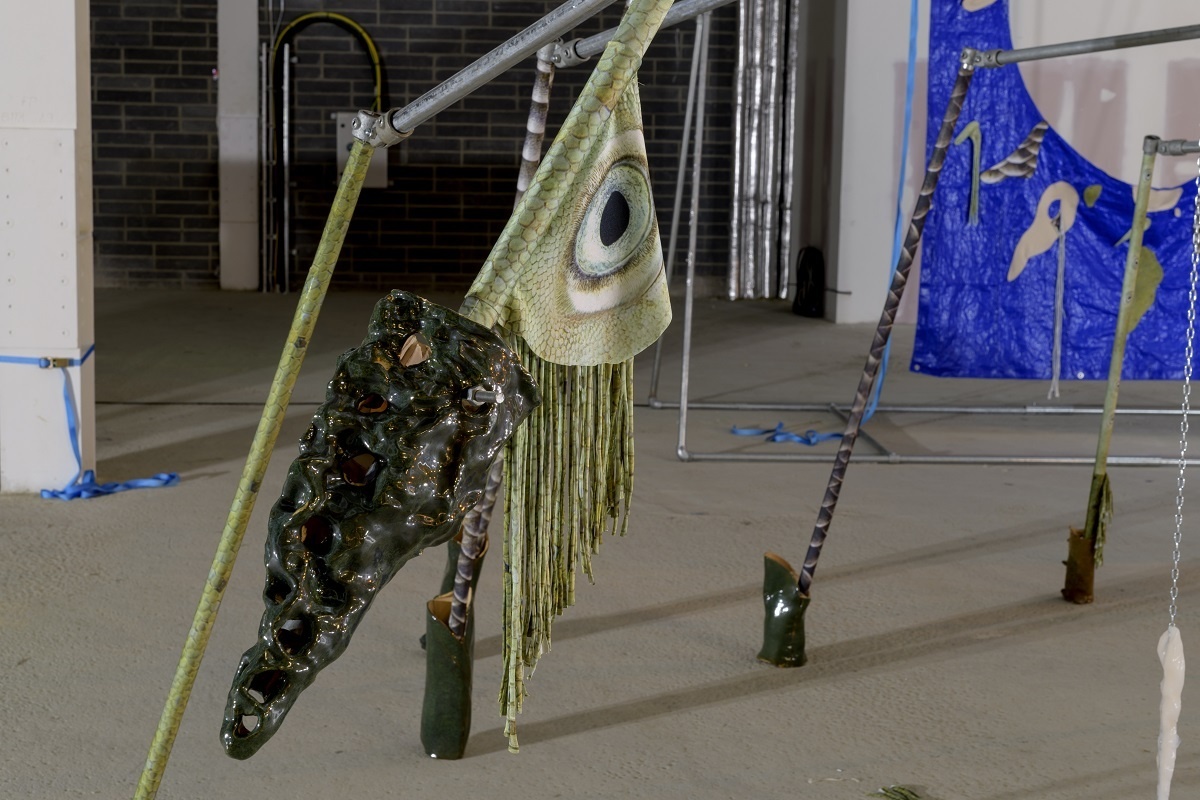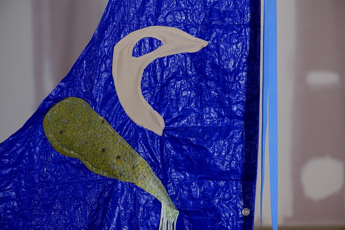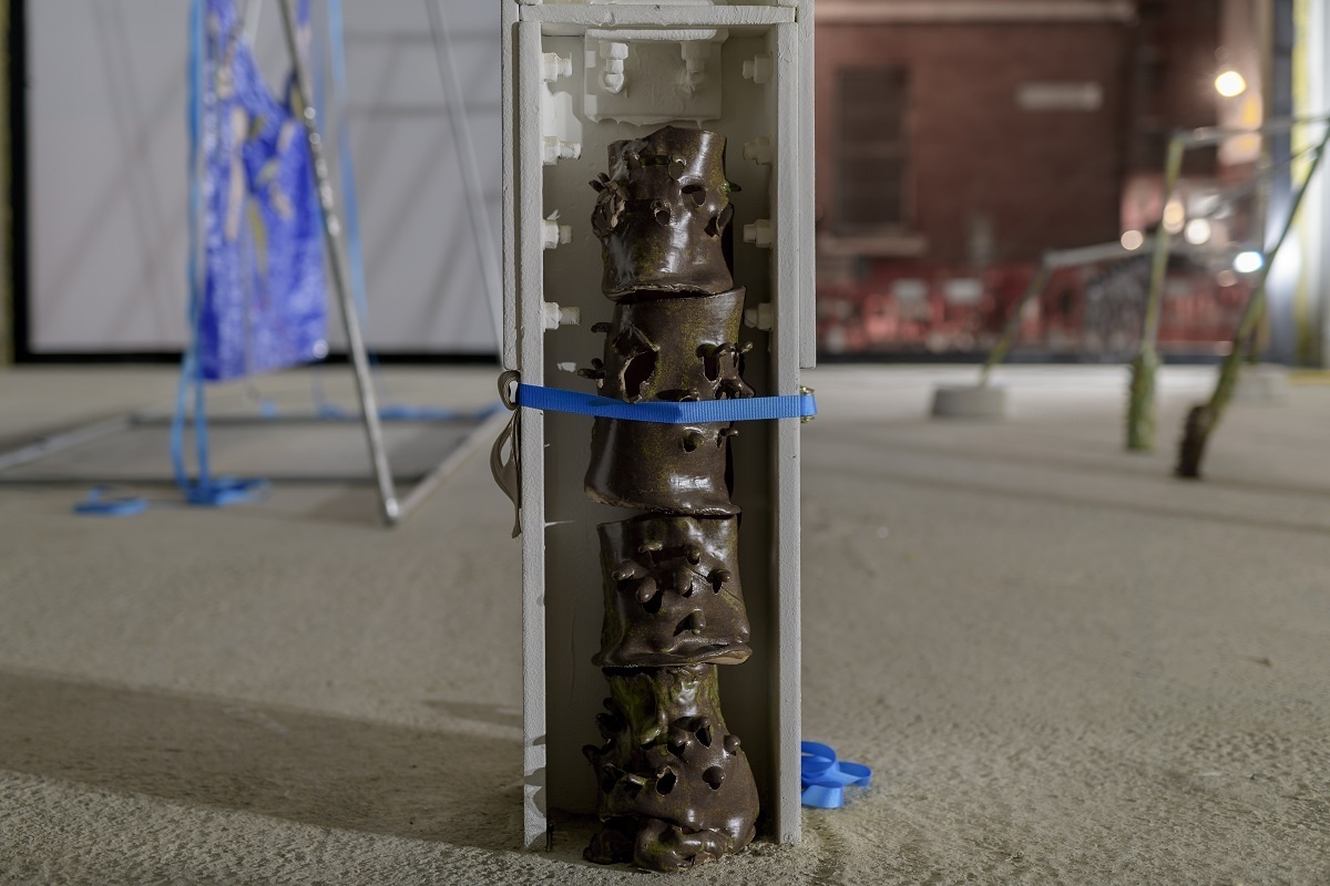A scaffold is assembled into a large skeletal frame, it holds everything together. Materials, such as resin, tarpaulin, steel, plastic, cord, clay, concrete and pallets are put into contact with soothing handmade elements. Surfaces are decorated through sewing, cording, knotting. Limbs adorned with ceramic armour. Safety harnesses are strung beside resin moulded sculptures. Their jelly-like translucency evokes the remnants of fleshy innards, or perhaps, prophetic of fossilised plastics conceivable in our future geology. A vibrant tarpaulin hangs as a scenographic backdrop. Its centre a hole that mirrors the building’s overhead beams. It manifests the atmosphere of a staging. Cloaked in beauty. Battered and glimmering, Deep time empaths appears as a makeshift animal-hybrid sculpture, an anthropomorphic creature occupying this space.