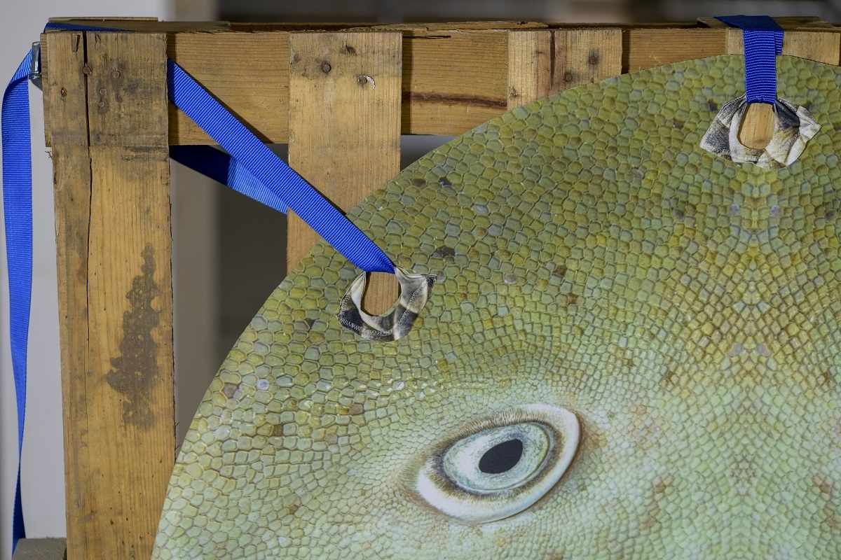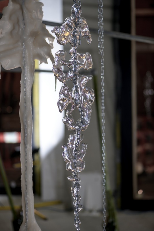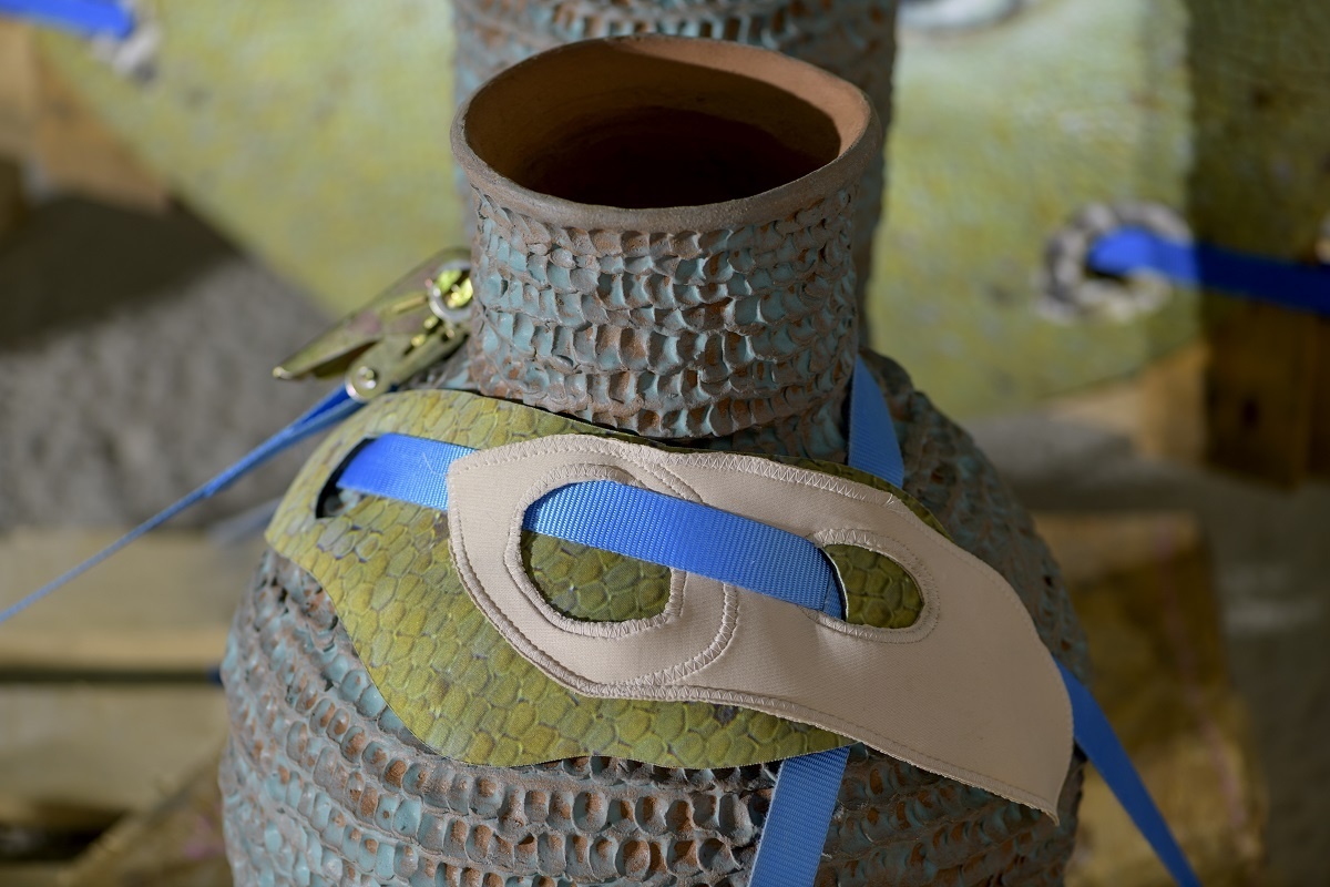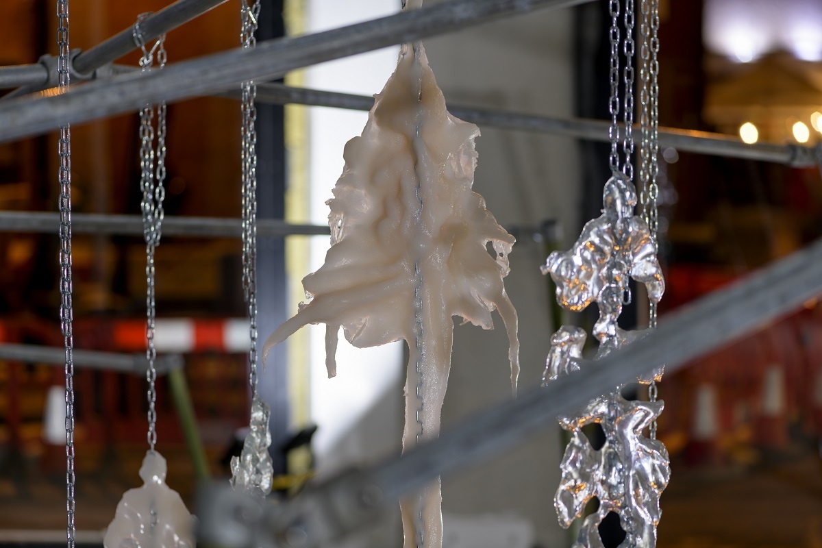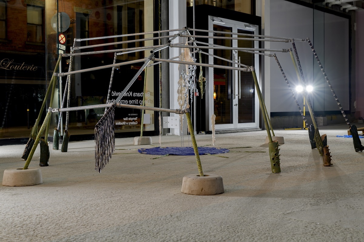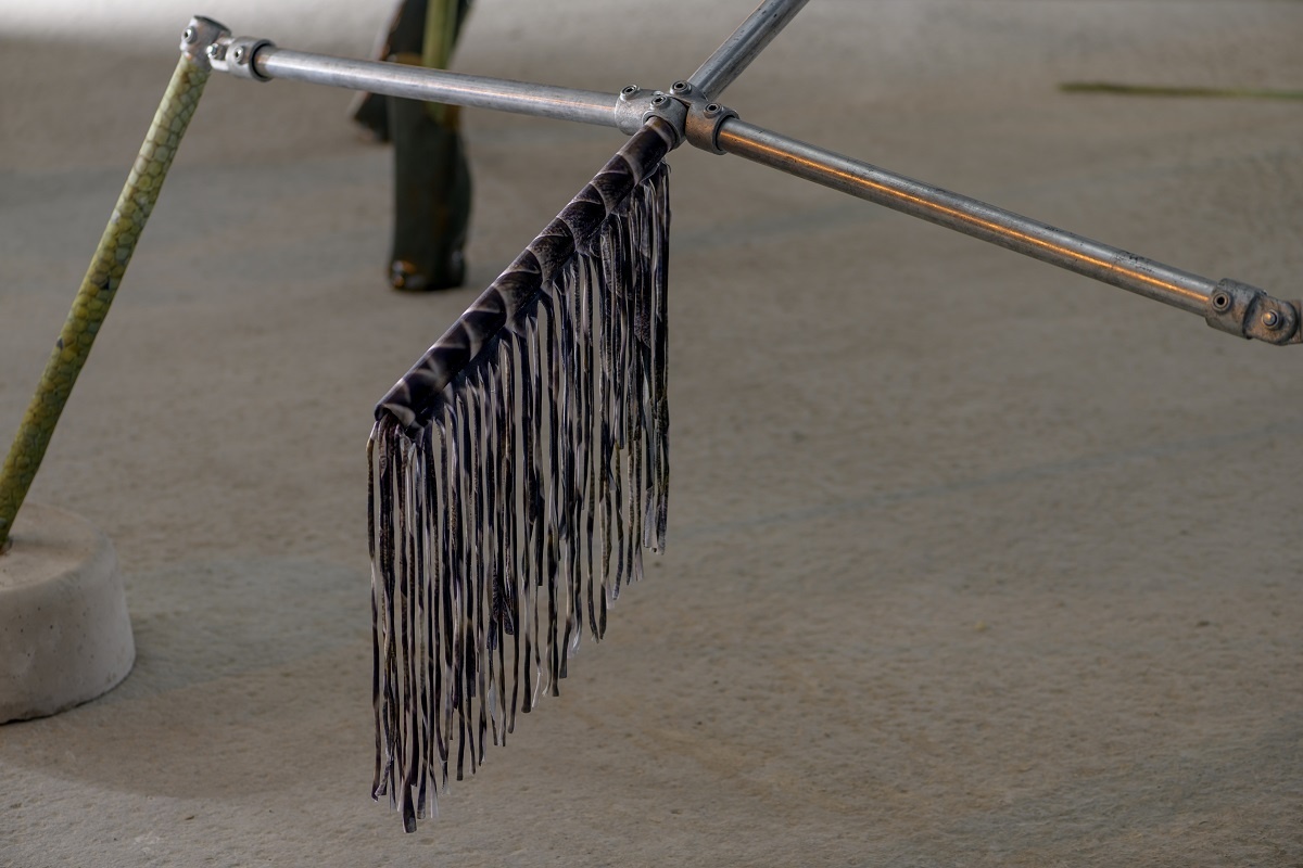 A scaffold is assembled into a large skeletal frame, it holds everything together. Materials, such as resin, tarpaulin, steel, plastic, cord, clay, concrete and pallets are put into contact with soothing handmade elements. Surfaces are decorated through sewing, cording, knotting. Limbs adorned with ceramic armour. Safety harnesses are strung beside resin moulded sculptures. Their jelly-like translucency evokes the remnants of fleshy innards, or perhaps, prophetic of fossilised plastics conceivable in our future geology. A vibrant tarpaulin hangs as a scenographic backdrop. Its centre a hole that mirrors the building’s overhead beams. It manifests the atmosphere of a staging. Cloaked in beauty. Battered and glimmering, Deep time empaths appears as a makeshift animal-hybrid sculpture, an anthropomorphic creature occupying this space.