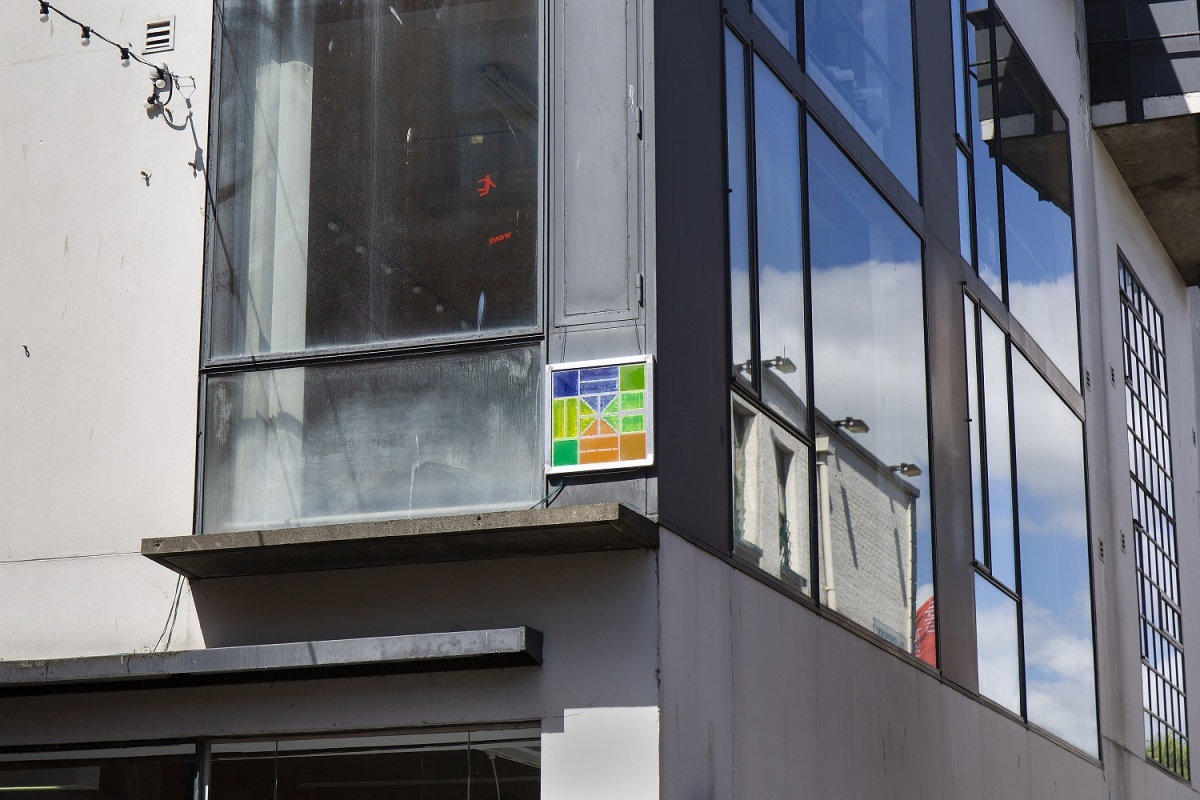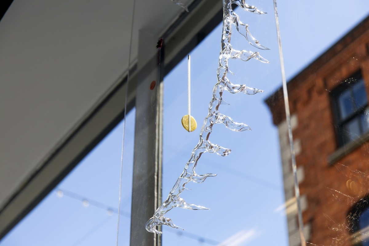 The exhibition incorporates sunlight caught by a street facing solar panel, a threaded assemblage featuring unused galalith(1) stock, recycled rubber safety surfacing, large scale suspended sculpture and a human/non human soundscape (solar controlled). Gault worked with independent feminist curator Katherine Murphy to research and realise this body of work, undertaking a collaborative studio residency at TBG+S.