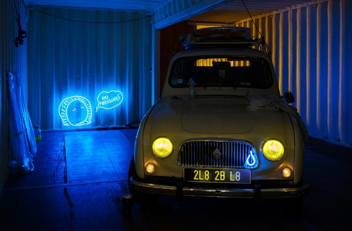 Two embellished shipping containers hold precious cargo: a 1962 Renault 4 (R4) car reanimated by the artist from her late father’s dusty shed in her hometown in the Rhône-Alpes region of France. For many years, the car sat idle among a jumbled assortment of other objects that were initially discarded: bikes, lamps, ashtrays, tools, machine parts, camera equipment, piles of scrap metal, ladders, and countless other everyday artefacts amassed by Puthod’s father with the optimism that they may have a second chance at a life of use.