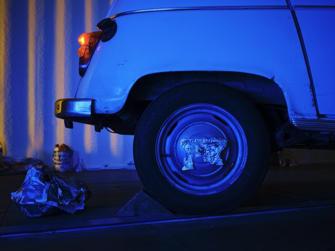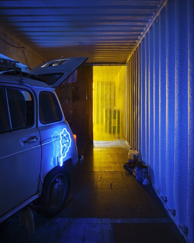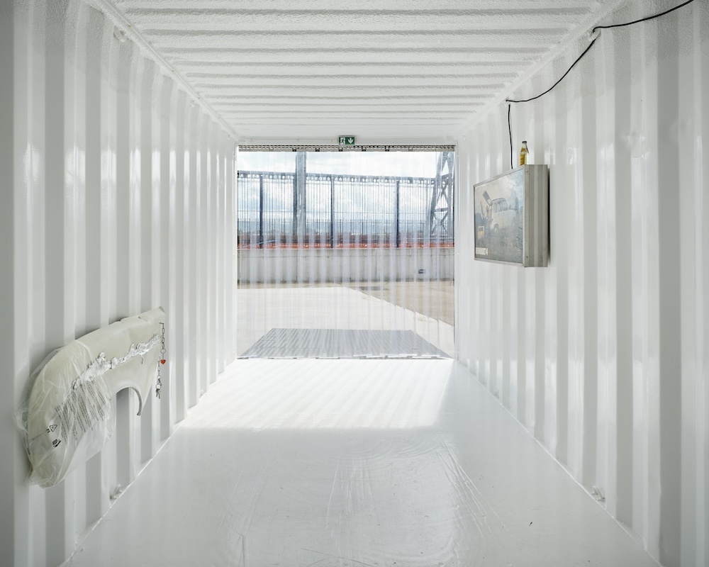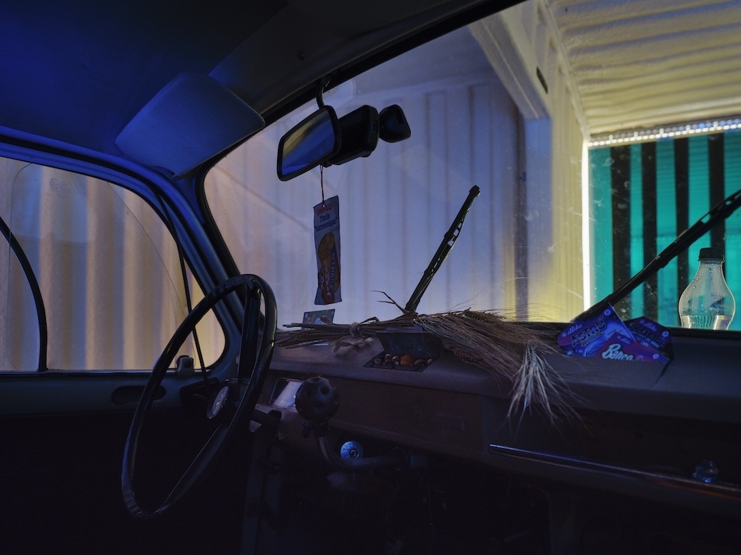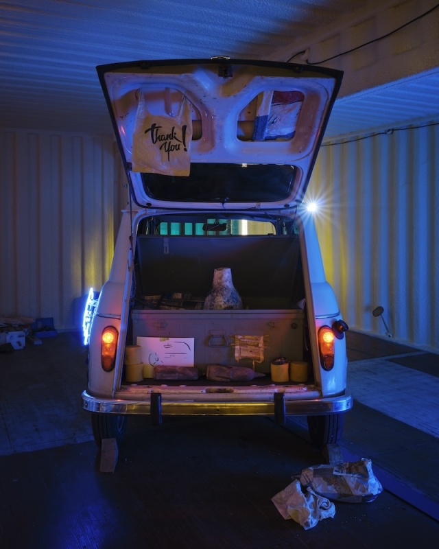 The journey continues in Dublin Port through a sequence of chambers built within the shipping containers. These rooms are constructed with a hybrid of handmade and machine-made ‘grave goods’ inspired by the artist’s studio, her father’s shed, the mechanic’s garage, and the factory plant. Akin to a chariot excavated in an ancient tomb, the R4 temporarily occupies the innermost vault, with foam-lined walls that cushion and protect this treasured hoard. Rather than being surrounded by canopic jars, stone tablets and untold riches, Puthod’s R4 is complemented with coolant cylinders, repair instruction manuals and scratchcards. As well as being adorned with custom-fabricated parts and decals, discreet mementos from its epic journey across France are stashed in the glove box and dangle from the windshield.