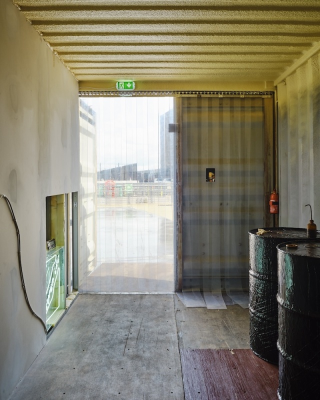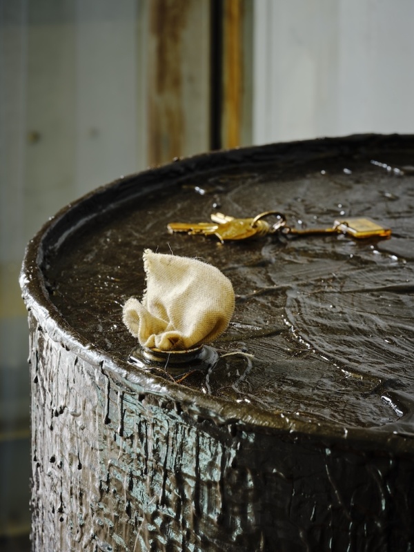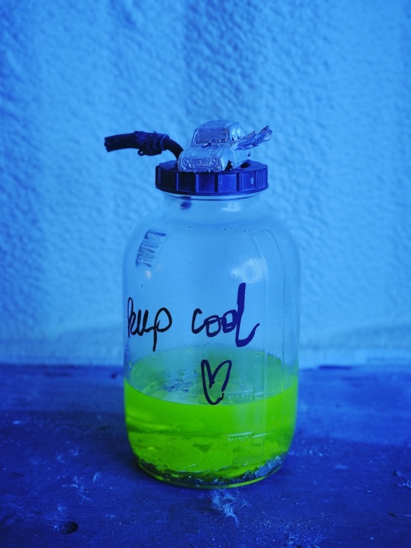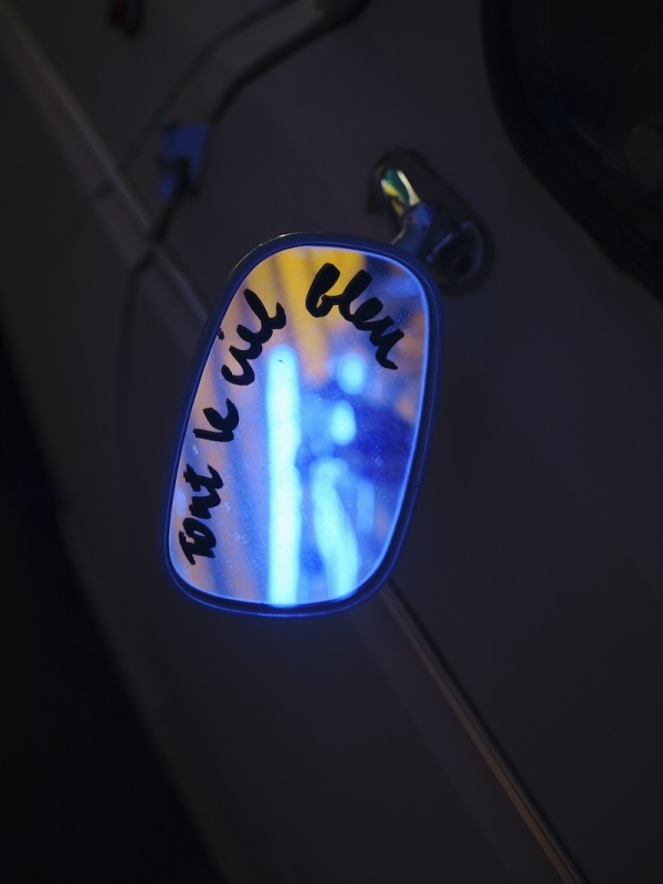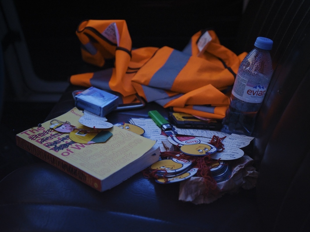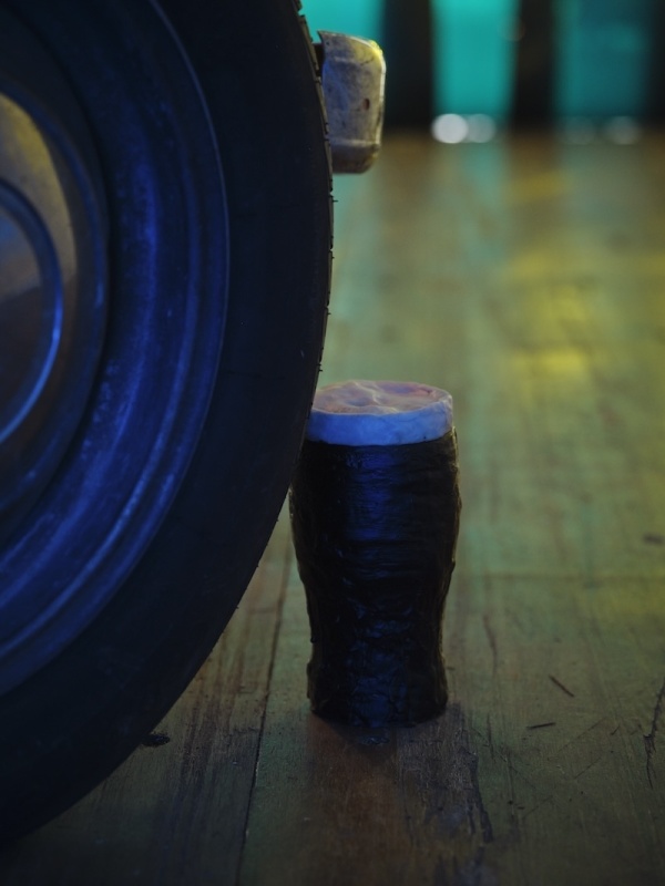 The journey continues in Dublin Port through a sequence of chambers built within the shipping containers. These rooms are constructed with a hybrid of handmade and machine-made ‘grave goods’ inspired by the artist’s studio, her father’s shed, the mechanic’s garage, and the factory plant. Akin to a chariot excavated in an ancient tomb, the R4 temporarily occupies the innermost vault, with foam-lined walls that cushion and protect this treasured hoard. Rather than being surrounded by canopic jars, stone tablets and untold riches, Puthod’s R4 is complemented with coolant cylinders, repair instruction manuals and scratchcards. As well as being adorned with custom-fabricated parts and decals, discreet mementos from its epic journey across France are stashed in the glove box and dangle from the windshield.