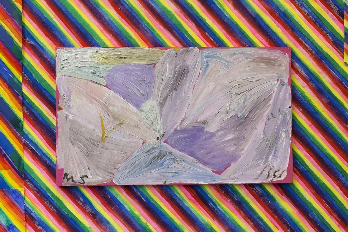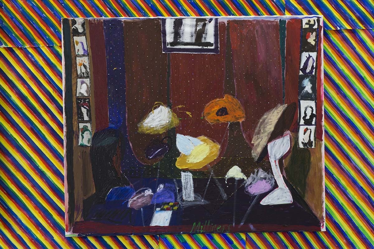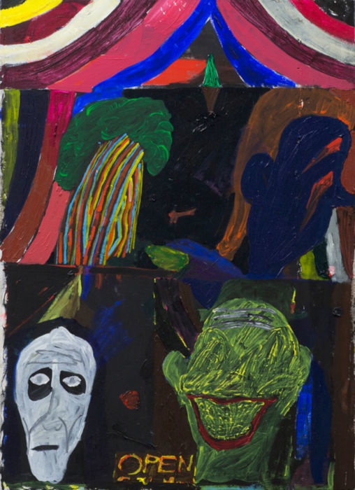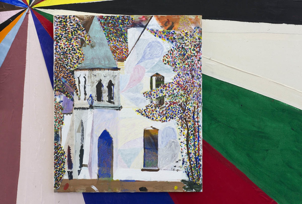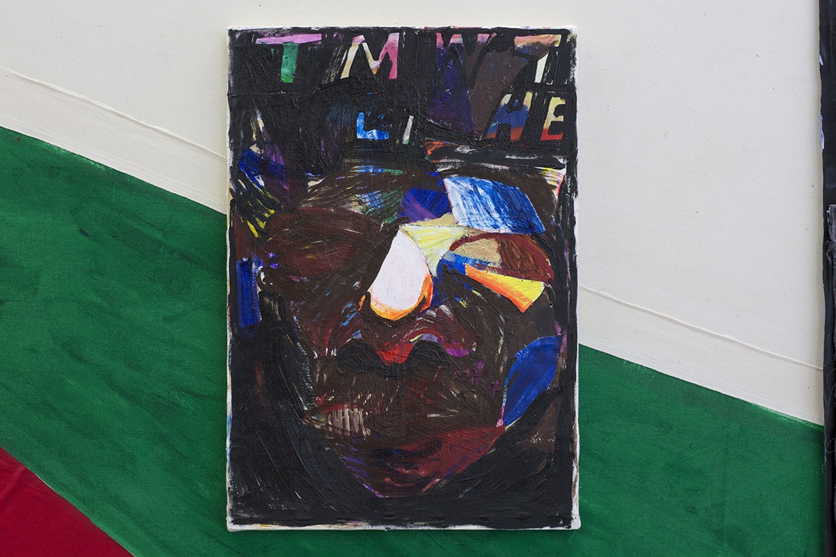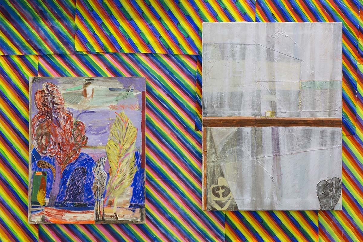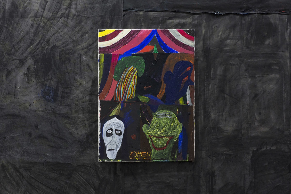 The motifs in the work are taken from the everyday and reference charity shop windows, graffiti, amateur posters and signage, all of which stem from the artists’ surroundings. The landscape and modernist architecture emerge from the more subdued work. Text appears in the paintings often receding into the background of the work. This play with concealment and exposure is consistent throughout the work.