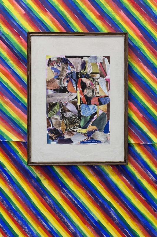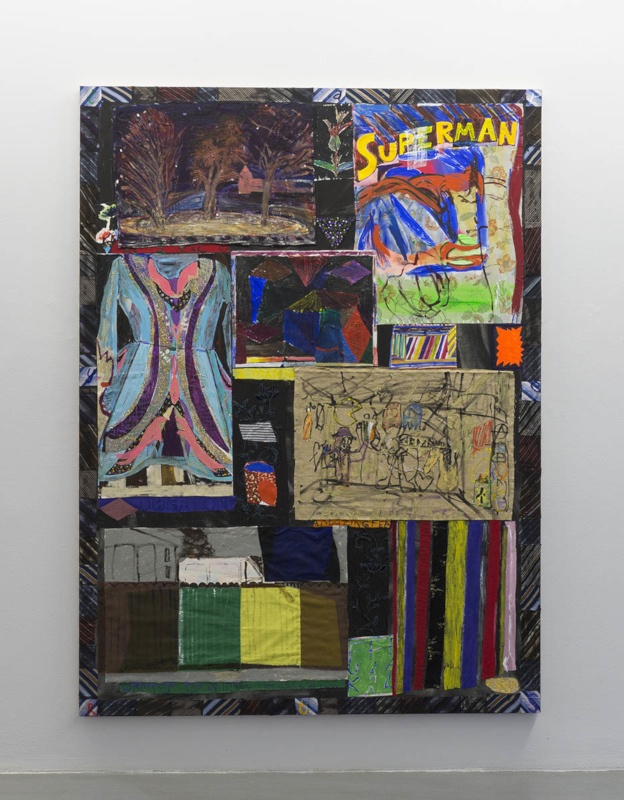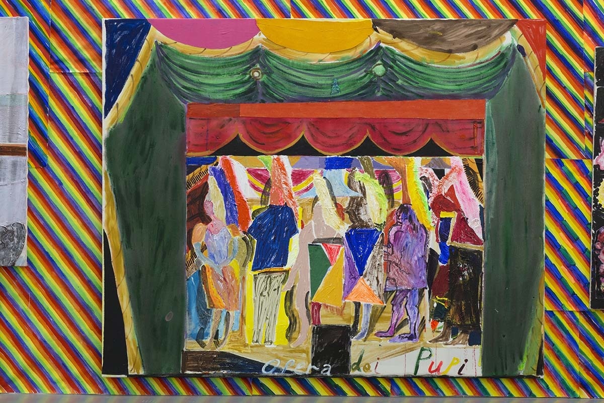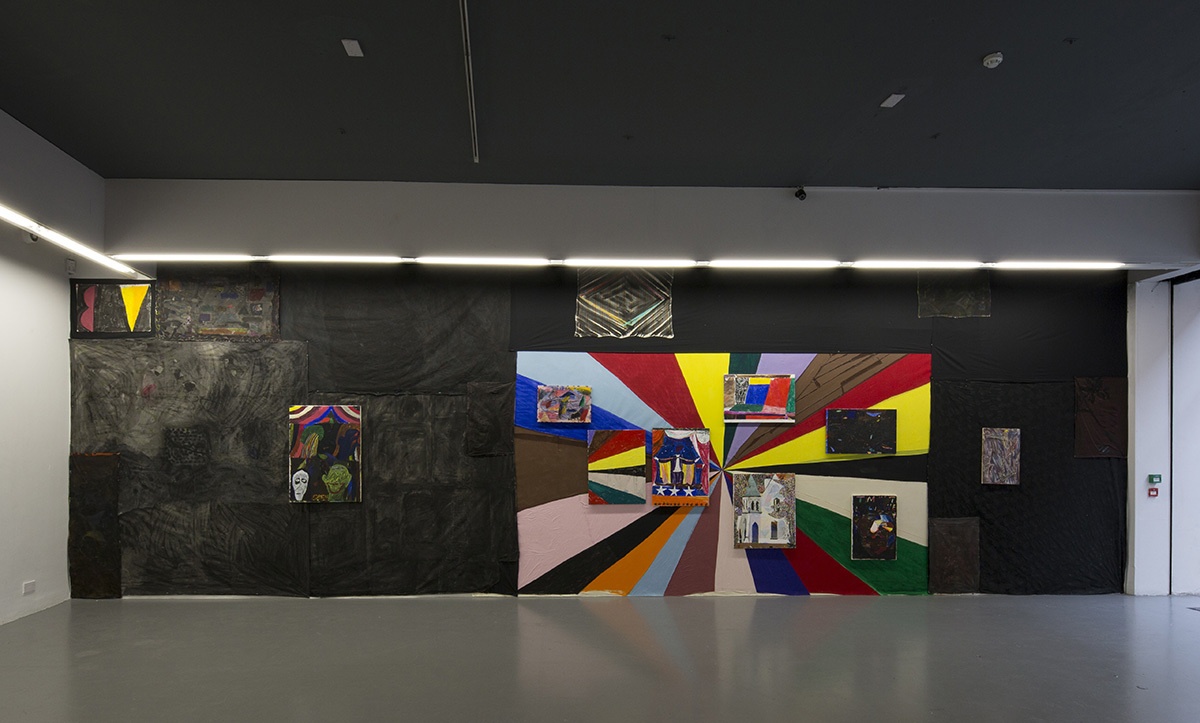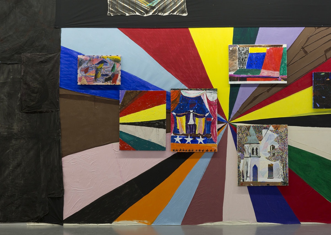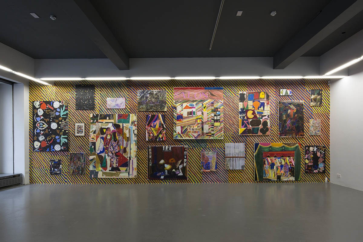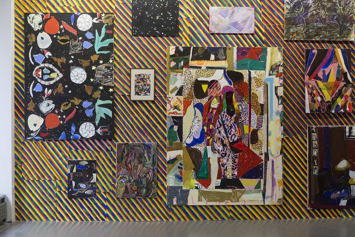 For Temple Bar Gallery + Studios, Mark Swords has created theatrically staged paintings that have come into being through a series of gestures that juxtapose the idea of making and unmaking. The paintings, often overwhelming in chromatic saturation and design denote the artist’s instinctive knowledge of colour. Layers of mark-making create a screen through which the buried undertones and colours emerge. He consistently moves between abstraction and figuration looking for discoveries and accidents in his works, appropriating painting conventions to create a stylistic collage. The hand-made is a significant element in his practice, printed fabrics are stitched to the canvas creating layers of shapes and forms, while the paint application can be both refined or crudely impasto. Within some of the paintings he has used draped curtains to create a framing device. A painted backdrop pinned to the wall becomes the larger framework for the paintings. These framing devices anchor the work in a celestial sphere creating associations between the paintings while playing with ideas of display and exhibition making, Swords creates a complex mosaic of works that can be viewed as a whole or singularly.