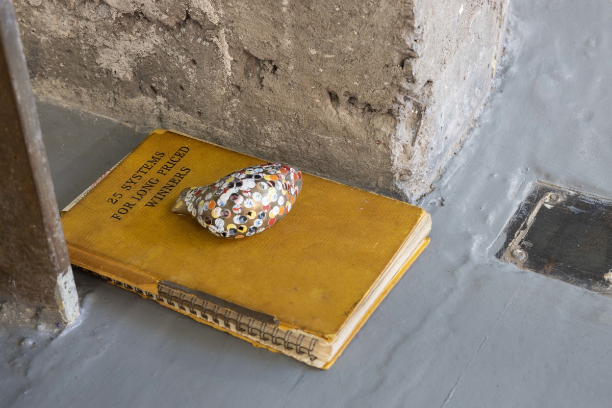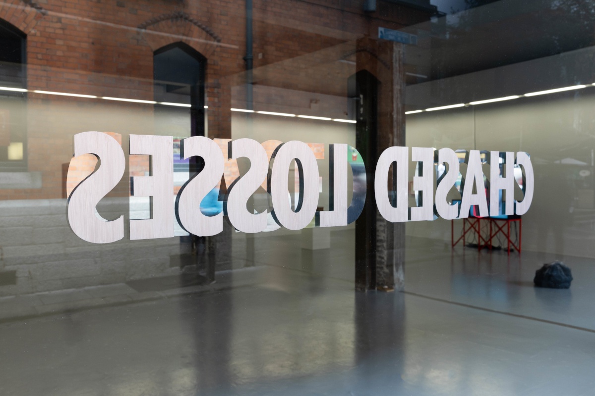 Edwards’ ongoing fascination with layering is reinforced by a painting on the gallery window, chased losses sessol desahc (2022). As a title and an exhibition, chased losses is a testament to gambling and chance, and perhaps a wider observation about unfulfilled betterment. The phrase is painted in reverse on each side of the glass directly facing itself. The lettering is applied with mirrored ink, which reflects the two iterations of the phrase back upon themselves. The resulting slivers of mirrored typographic appendages and letters are visible within the curves and spaces of the stencilled text. The mirroring effect causes a drop shadow, a typical signwriting technique, and one which opens the artwork to the visual language of the city street on which the gallery is located. Similar application of silver and mirrored signwriting was historically prevalent in antique shops and pawnbrokers, but more recently tattoo parlours – all of which connect ideas of legacy, permanence, and inheritance. The template for the sign also notably uses a font well-known as the headline typography for The Sun newspaper, which connects to the sensationalisation of the mundane and ordinary, and an allusion to a ‘working class’ voice. The duller side of the painted phrase, which faces away from the viewer is reminiscent of the surface of lottery scratchcards, perhaps gesturing to the promise of the precise moment before a potential loss (or gain). This suggestion of a scratchcard represents something that is just out of reach, and also reinforces a phenomenon that can be endlessly repeated, perhaps without ever experiencing a significantly different outcome.