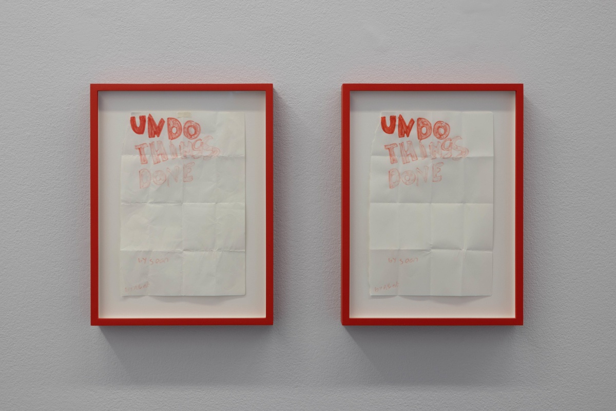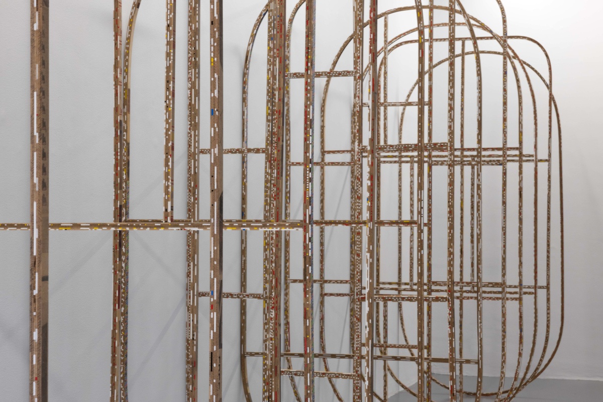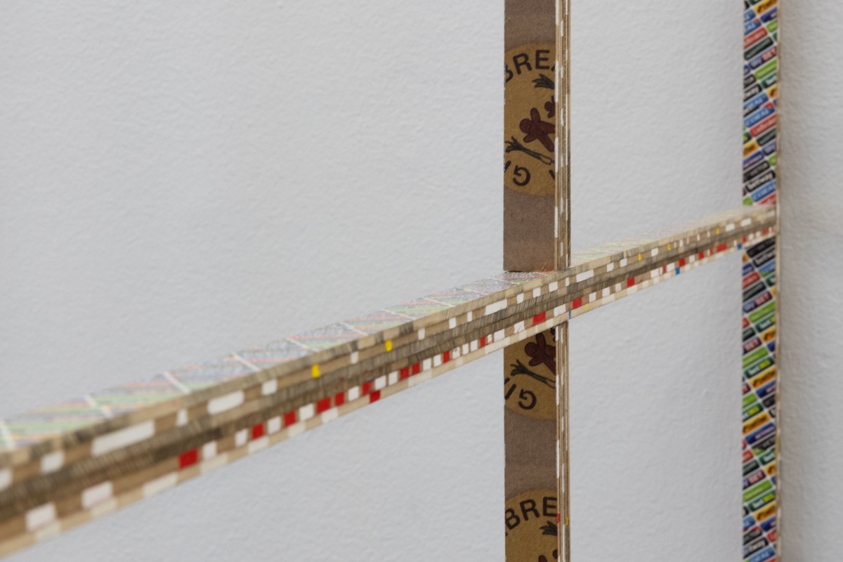 Stations (2022) is a major new work in the exhibition, a series of fourteen frame outlines made from thin cuts of MDF. The frames have curved corners with various gradients and interior cross-bars based on a grid of thirds and quarters. This similarity to layout guides for the design of books or newspaper columns, allows adjustment to form within pre-determined rules. These rounded edges are a reference to the distinctive window shapes of a shop unit in the Maelfa shopping centre, Cardiff; the subject of several previous works by Edwards, including a significant film (Maelfa (2010)). The facing edge of each ‘station’ is printed with a selective section of several larger collages, one containing a closely-set mesh of logos from different bookmakers that are widespread in UK highstreets and suburbs. These logos represent an unavoidable temptation for many people who are dependent on the gratification of winning and therefore also encompass the inevitable losses (sometimes monetary, and sometimes more far-reaching). Other surfaces are printed with segments of a large digital collage of scanned images, newspaper clippings, letters and betting slips accumulated by the artist over many years, foregrounding a personal archive that recurs throughout his work. The facing sides are drawn on and painted with graphical details, using closely repeated pencil lines and sections of coloured paint of different widths. These details represent fleeting glances and moments of recognition within Edwards’ process, as well as highlighting the principles of hand-made labour, concentration and recurrence. The fourteen structures culminate into the collapsing and looping of shapes within the framework, encouraging moments of stillness, pause, reflection, and moving on. When viewed as a close-knit group, as in this configuration, the sensation of stuttering, faltering, reprise, and persistence is even more impactful.