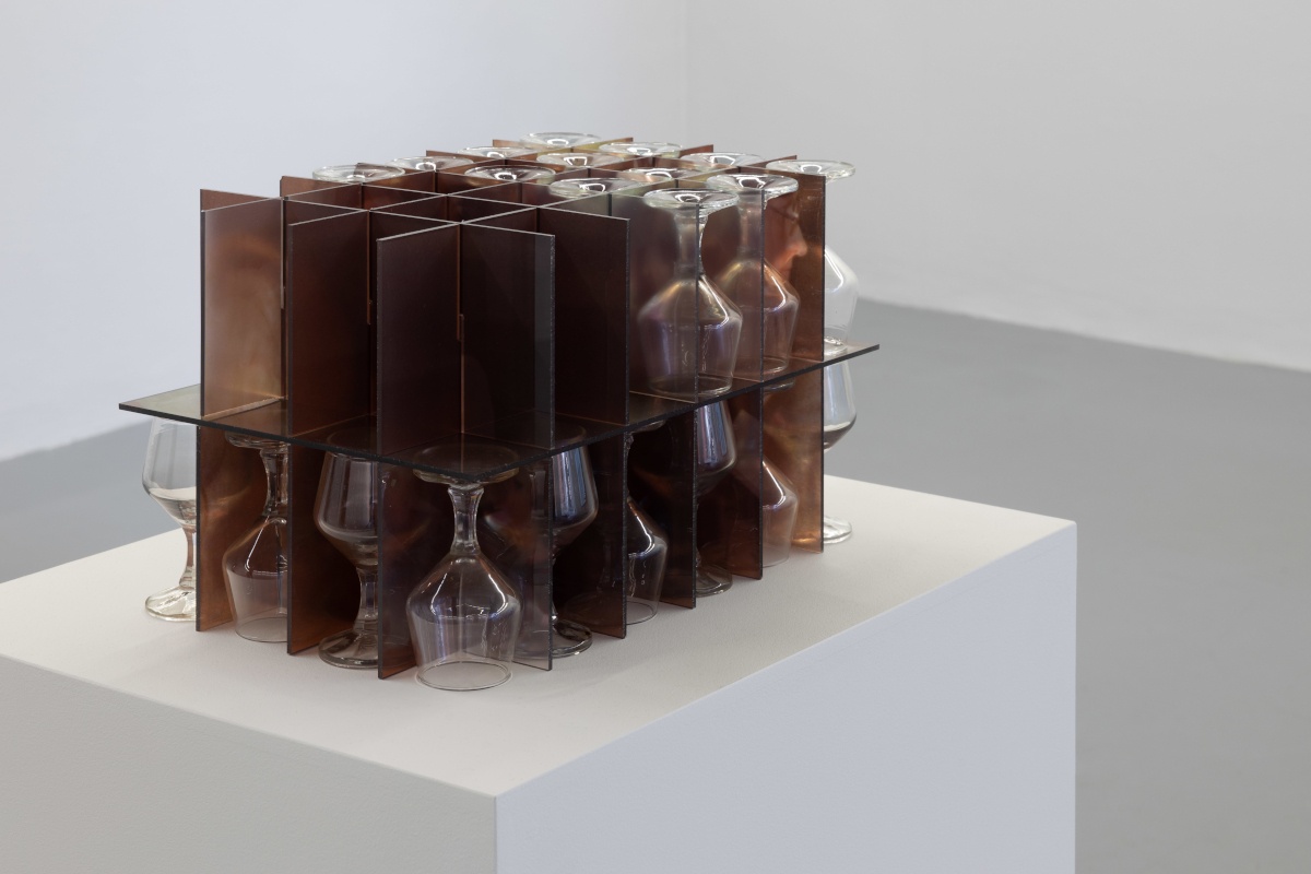 A physical interpretation of the bag has also been produced in Perspex layers (Inheriting Absence (Bag) (2022)). Each sheet has the trophies’ cross-sections printed onto its surface, ultimately building up a dense and compressed representation of personal history within this memorial device. The forms of the trophies are barely visible within the bag creating an implied impression of their presence. Edwards’ occupation with layers of transparency is reflected in Inheriting Absence (Glasses) (2021), a sculpture that repurposes the toasting glasses from the wedding of the artist’s parents. The usual cardboard separator for storage is remade in printed Perspex sheets with photos of the parent’s wedding day. The images hold subtle indications of imposed cultural pressure that has a generational impact. The noticeably absent sherry glasses allude to the passing of time and the gradual loss of people and the memories associated with them throughout life.