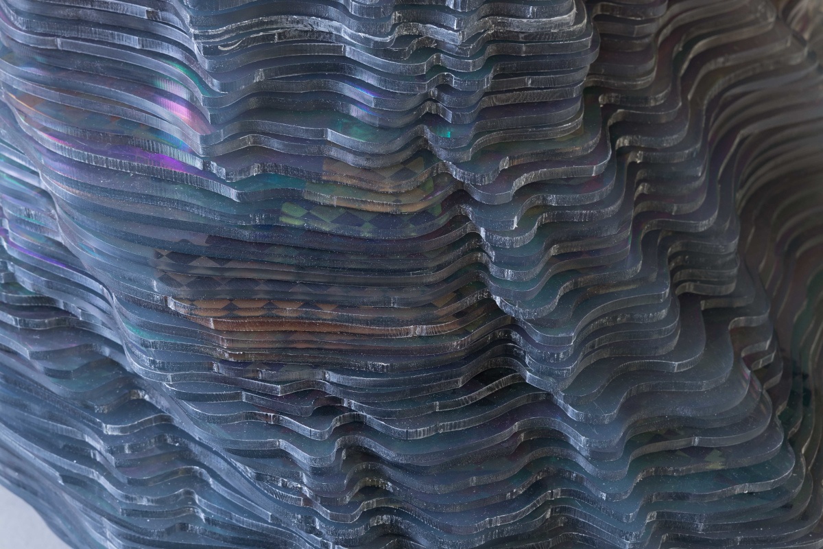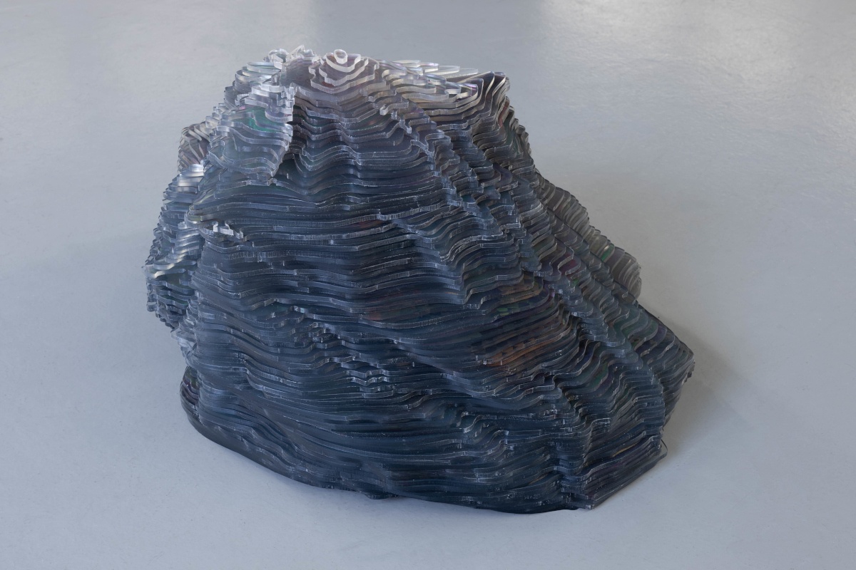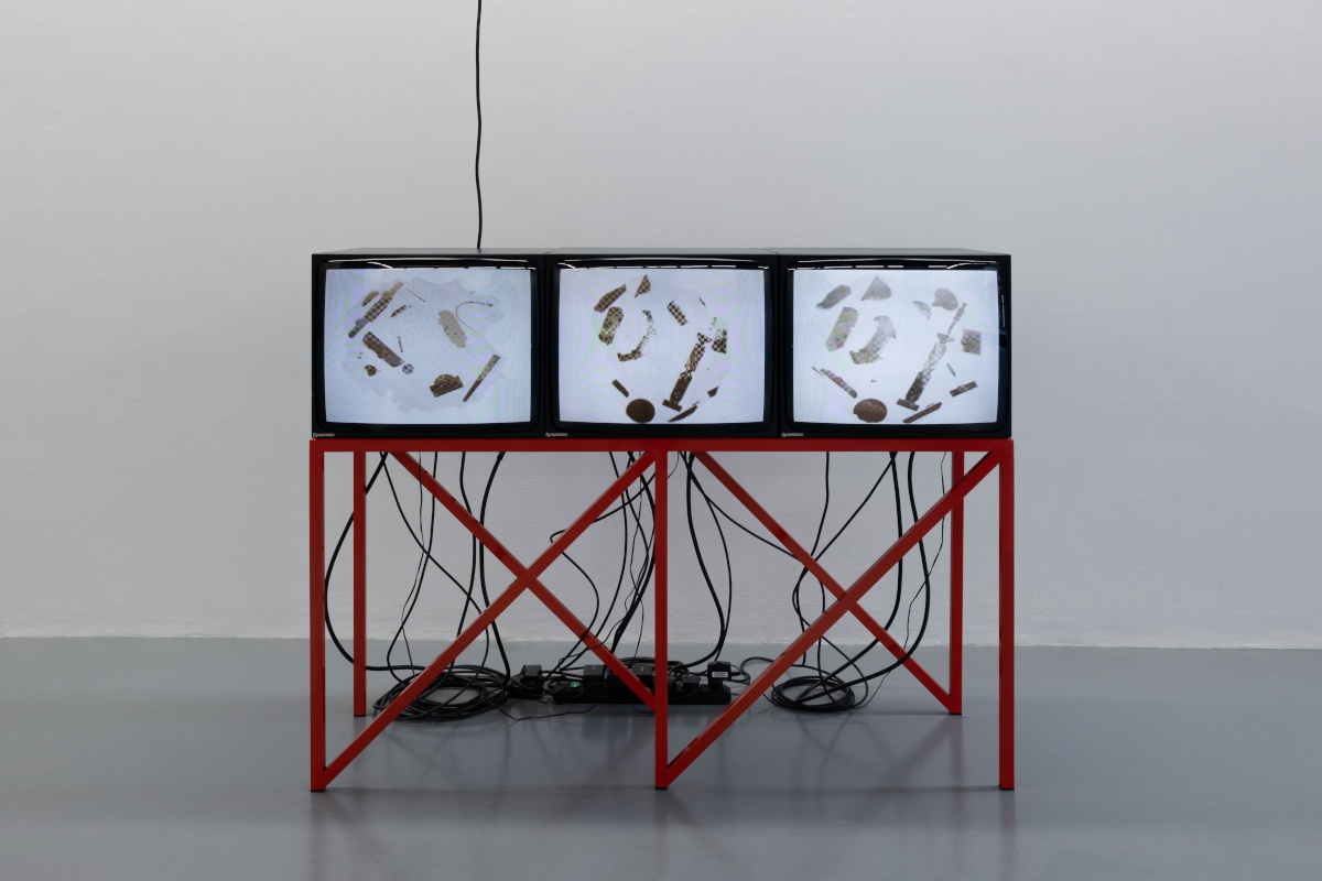 Two new works in this exhibition use a digital recreation of the bin bag and its contents, simulating the weight of the trophies and their effect on the elasticity and tension in the plastic bag as if it has been lifted and cast aside. The 3D model of the filled bag is then digitally divided horizontally into slices, each showing a cross-section of the trophies within – effectively excavating layers of memory and time. The cutaway sections of the trophies are represented by a collage made by the artist: a chequerboard overlaid on imagery assembled from Edwards’ personal archive. The 3D model is then interpreted through both physical and digital sculpture and film. In Untitled (2022) each cross-section of the model is cycled through an animated sequence, drawing to mind an MRI or an archaeological LIDAR scan. The cutout sections recede and expand as the outlines of the trophies are formed and deconstructed. The three synchronised monitors cycle, stutter and come to a halt, in a pattern that simulates the unpredictable rotation of fruit machine reels compulsively played by the artist’s father.