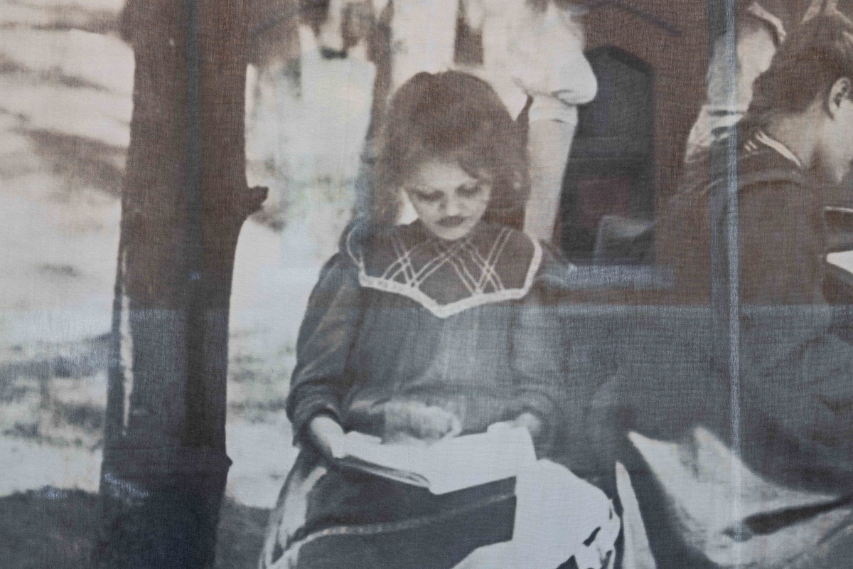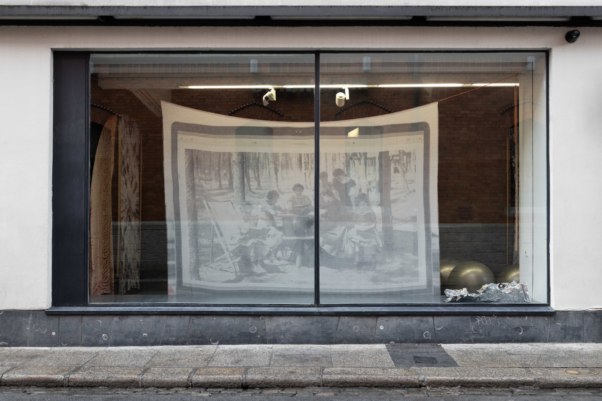 Sarah Pierce has focused on a specific structure, the concrete shelter in Phoenix Park, to describe sustained connections to public space. The shelter is the prompt for an expansive artwork made of a pamphlet, with research and texts by Donna Rose and Grace O’Boyle; a set of banners, scaled to the shelter’s interior, sewn by Aoife McLaughlin and dyed by Clíona McLoughlin; and a multi-lingual reading group led by Nasser Aidara. Each marks the shelter as a site of radical communality, study and care. The centre banner depicts a German Waldschule in 1904, a self-reflexive moment of protest and solidarity that captures our own awareness of ourselves as historical subjects of the pandemic.