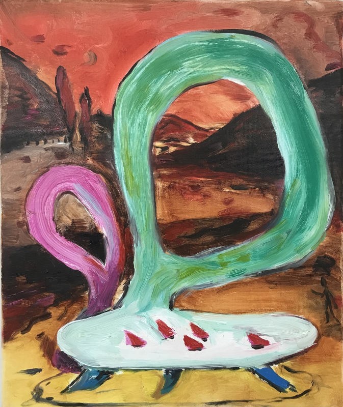 Her work draws from a variety of eclectic influences from ‘high’ and ‘low’ culture. From the classical painting of the 17th century western traditions to the writing of Stephen King and the humourist Ivor Cutler and the stories of James Joyce. She frequently return to motifs and imagery to reuse and rework them into other paintings. She considers her paintings as visual and philosophical problem solving. Her work focuses on how imagery interacts with the intrinsic qualities of paint, how the paint material moves and how it can be played with. The quality of paint handling, although seemingly casual, is a result of repeated attempts at getting something 'right'.