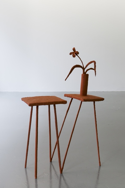 Andy Fitz’s sculptures are inexact versions of furniture and figures: familiar objects painted in a faded, near-monochromatic spectrum. Made in series, they appear to co-exist in a universe that omits us: a world in which action is arrested, colour is muted, light and shadow have form, and gravity seems less in control. Andy Fitz’s shapes are deliberately crude, reductive, and seemingly uncertain. Despite their handled quality, they present uniform and de-particularised images of the world, images structured by social and material norms. The sculptures often seem caught in a performance of their subjects, as though aware of being watched.