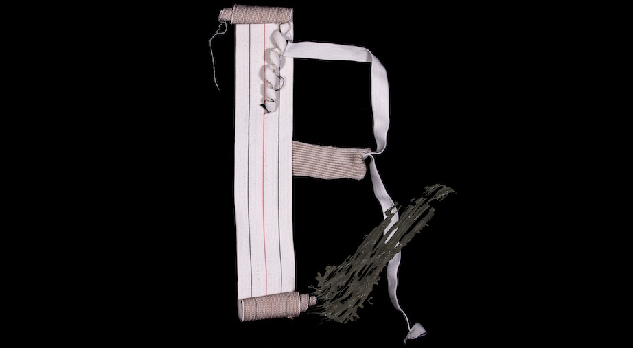 Image description: A white-beige jockstrap letter 'R' sits in the middle of a flat black background in this video still. A graphic brown-green CGI mud streak cuts across the right hand leg of the letter 'R' in a diagonal downward stroke.