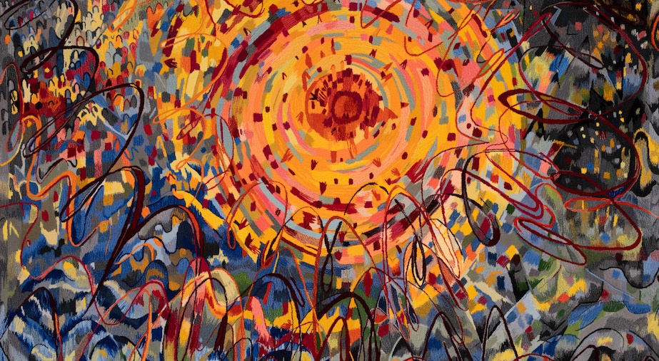Image Description: 'When the sky above will not be named' is a landscape format, wool tapestry. The central motif is a bright red, orange and yellow solar form in the upper third of the image. Comprising a series of concentric rings, interrupted by patches of other colours, the solar form fractures as it extends outwards. Gradually this 'exploding' sun dissolves into an array of grey and black organic forms. Vivid lines of blue, red and black loop energetically around the sun motif. The background is an undulating sea of greys, browns and blacks interspersed with flashes of yellows, reds, blues, greens and pinks.