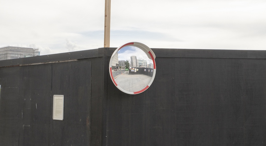 Image description: A photograph of black painted construction hoarding at the street corner of a building site. A convex hooded safety mirror is attached to the top left-hand corner of the hoarding on the right-hand side of the street corner. In its reflection is more construction hoarding and buildings in an urban landscape. On the left-hand side of the street corner is a planning permission notice placed on the hoarding. In the background on the left-hand side is a building under construction.