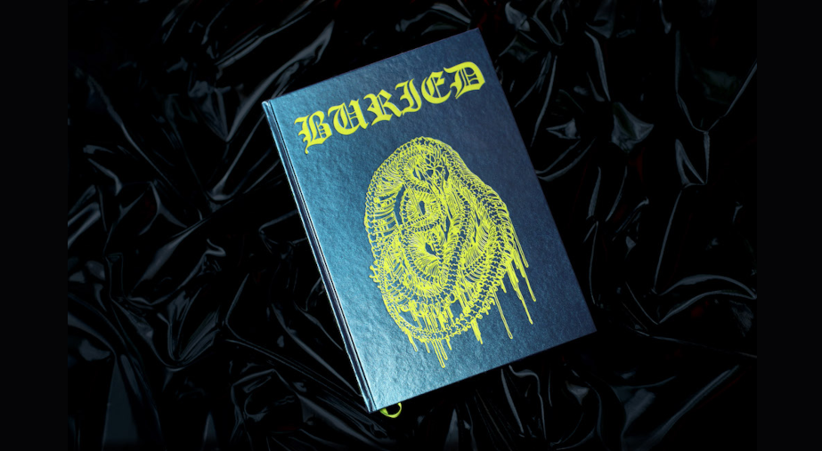 BURIED ZINE is a demoniacal, cosmic terror, an atrophying shambling mess of paralyzed organs evacuating putridity. Bound in hardback cases and laid out like a Victorian Grimoire, each publication explores heavy metal music and commissions fiction, photography, illustration, video art, and Virtual Reality experiences in their most bleak and morbid forms.