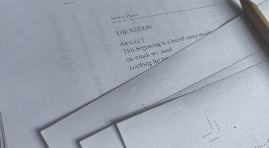 Between March 2024 and May 2025, writers and artists Clare Bell, Oein DeBhairduin, Sonya Gildea, Nithy Kasa, Nathan O’Donnell, Annemarie Ní Churreáin, and Susan Tomaselli, participated in a set of workshops together so as to jointly create the printed publication, State, in Relation, with its accompanying installation, Omitted Provisions which will be situated in the TBG+S Atrium during Dublin Art Book Fair 2025.
