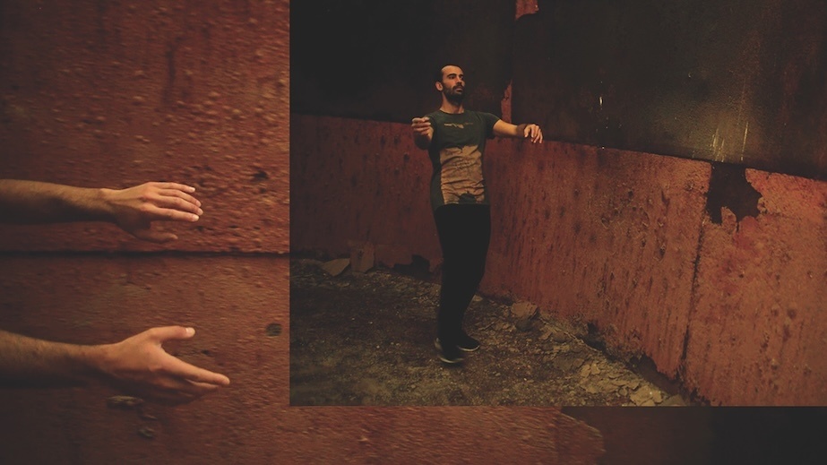 Image Description: A photomontage. On the right, there is a photo of a man is walking backwards. His hands stretched towards the viewer, his gaze slightly averted. Behind him is a curved, rust-covered wall and textured floor. This image is overlaid over a close-up image of the same rust-covered walls with two outstretched arms coming from the left of the frame.
