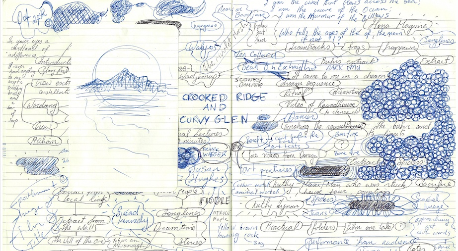 Image description: A scan from Ingrid Lyon's notebook displays a mind map drawn in blue and black biro across two off-white lined pages. The central words of the mind map read 'CROOKED RIDGE AND CURVY GLEN'. To the left, there is a loose sketch of a mountain scape. There are other scribbles, doodles and drawings dispersed throughout the map.